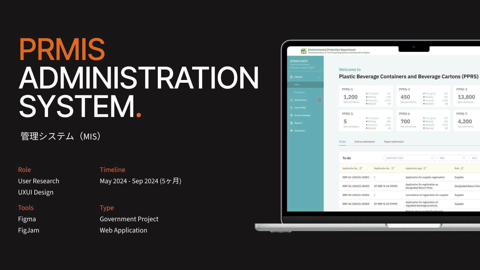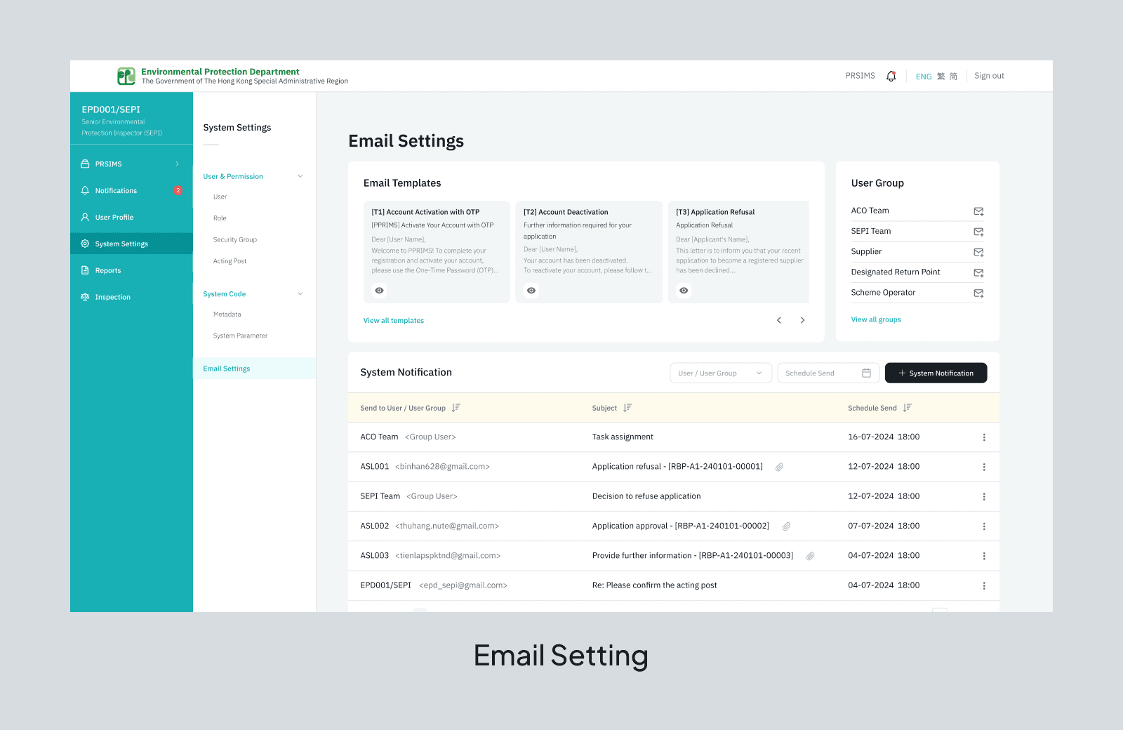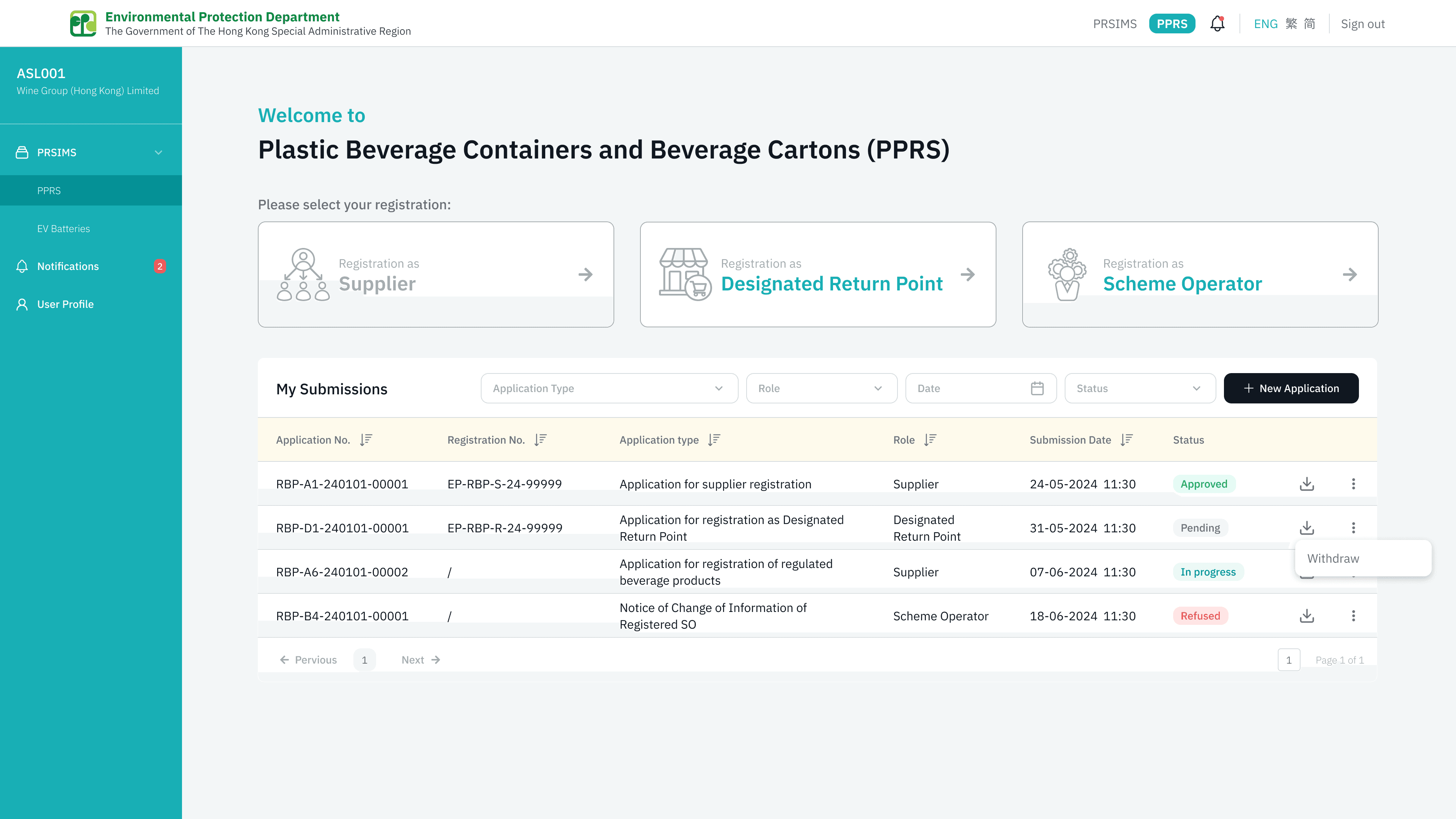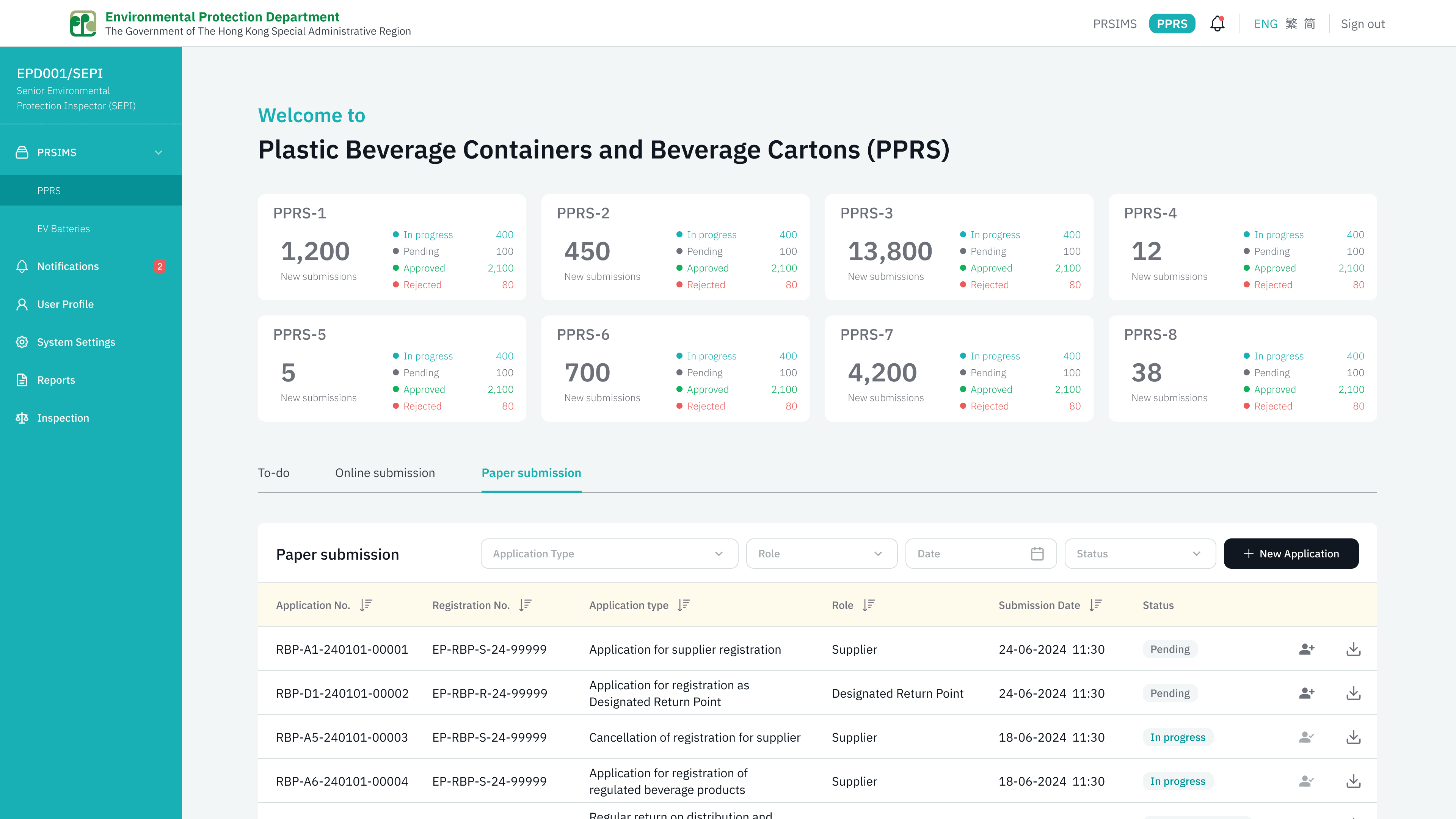 To provide a secure and user-friendly online portal for the user to submit applications and submissions, change of information during/after registration, endorsement of producer responsibility plan, etc. The System shall internal processing of the applications and submissions received by EPD users in a systematic, secure, reliable, efficient and convenient manner.