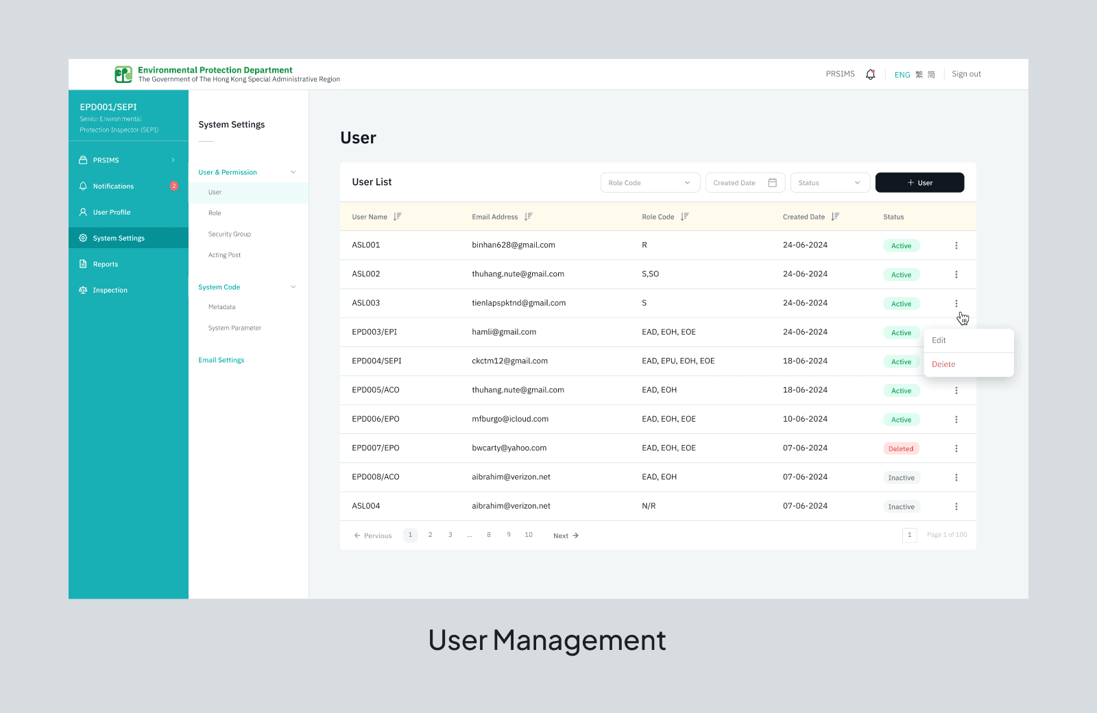 System settings include User and Permission Management, as well as System Code and Email Settings. After analyzing the structure of user permissions and system codes, my goal was to provide an intuitive, easy-to-use interface for organizational admins. The User Management interface offers detailed control over user roles and permissions, ensuring clear and efficient management.