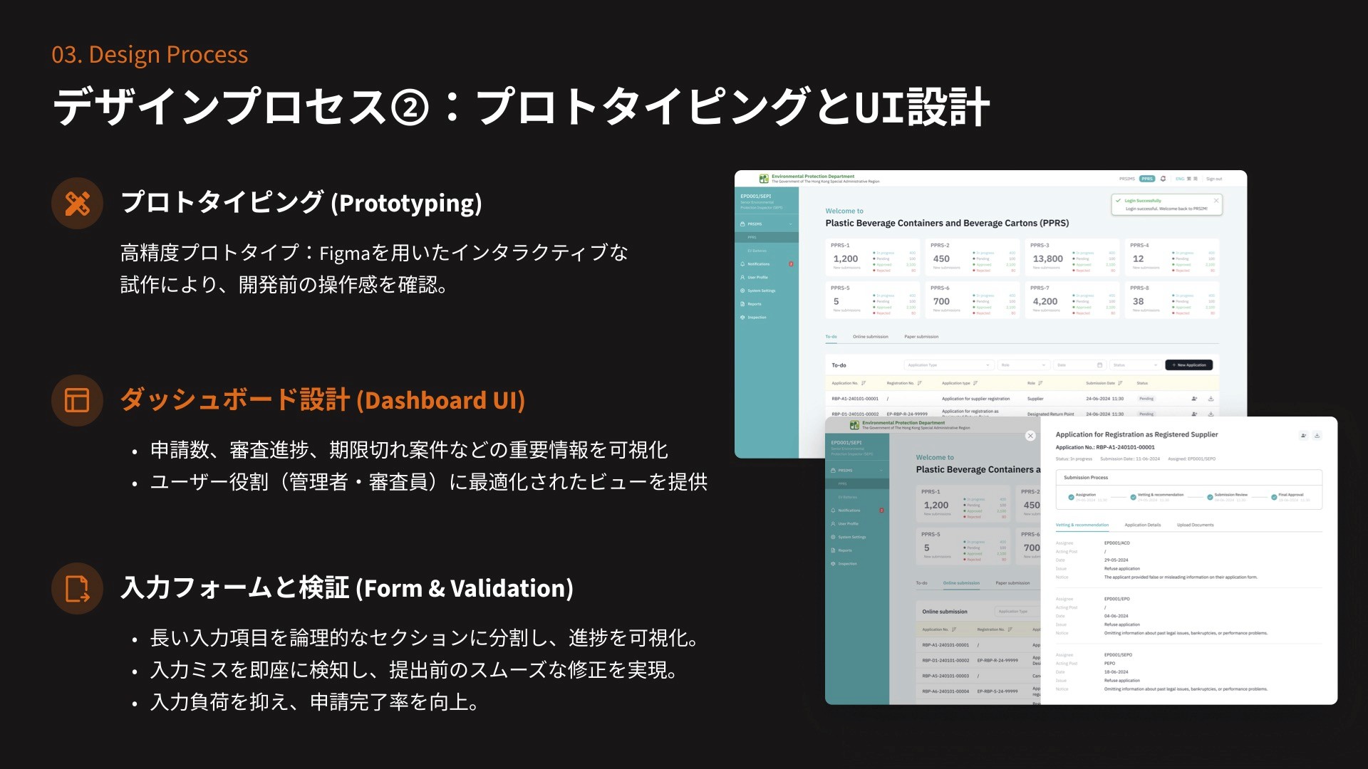 Designed for government officers, this section offers a complete view of all applications and their approval statuses. I focused on optimising table design and advanced filtering capabilities to ensure that offices can quickly locate the information they need.